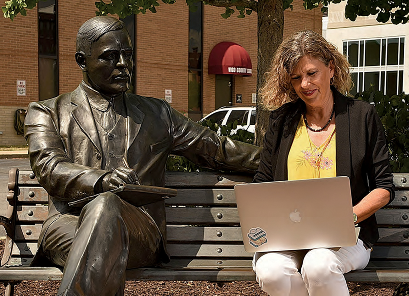 Terre Haute Women in Business honoree Gail Hayes writes on her laptop, while poet Max Ehrmann opts for pen and paper.