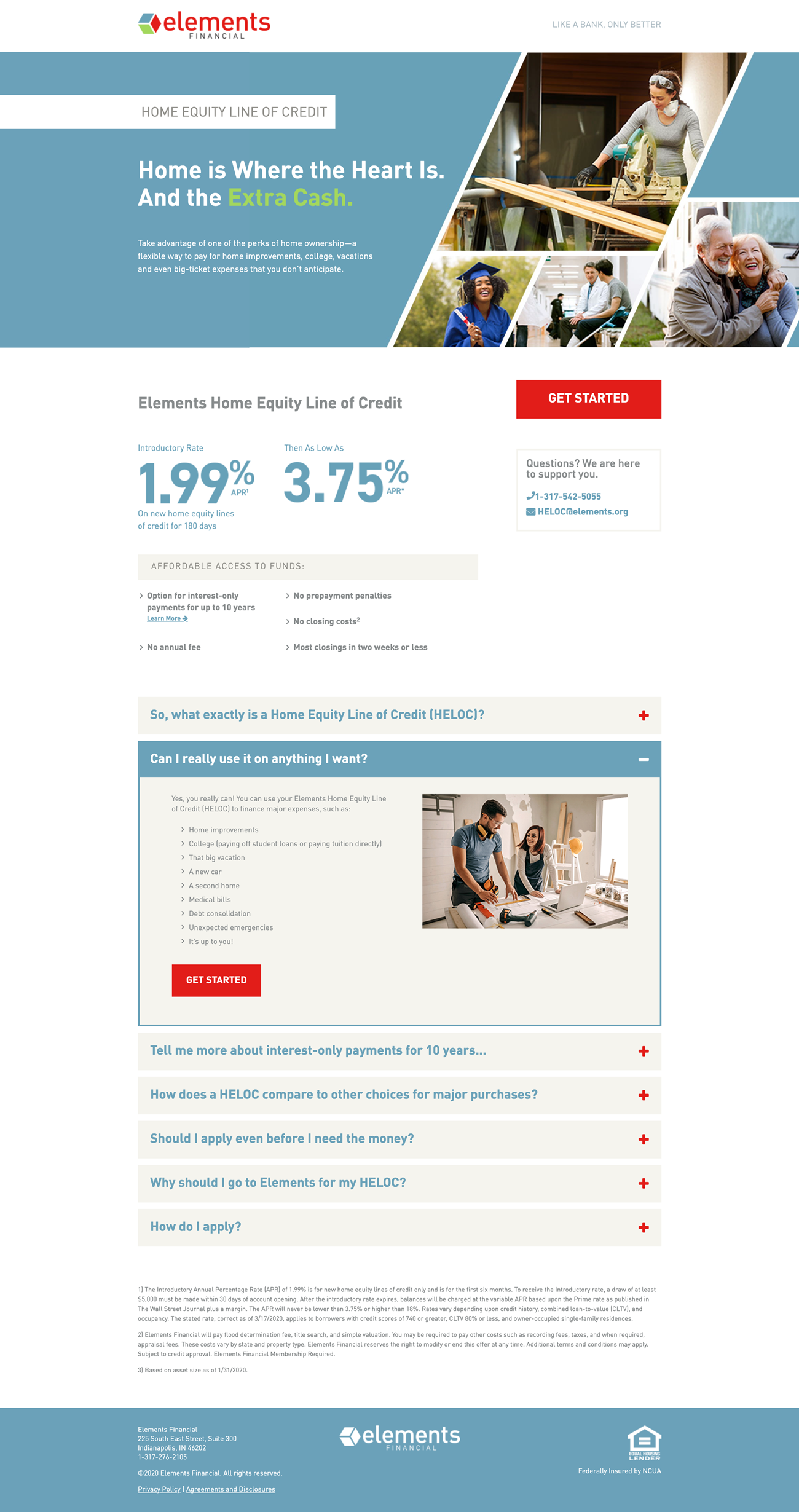 To make sure consumers understood what a HELOC is and how/why it can be used, we added an expandable Frequently Asked Questions section to the landing page. The section included helpful questions such as “So, what exactly is a Home Equity Line of Credit?” and “Can I really use it on anything I want?” Our objective was to provide just enough information to boost confidence in filling out the application without overwhelming them.