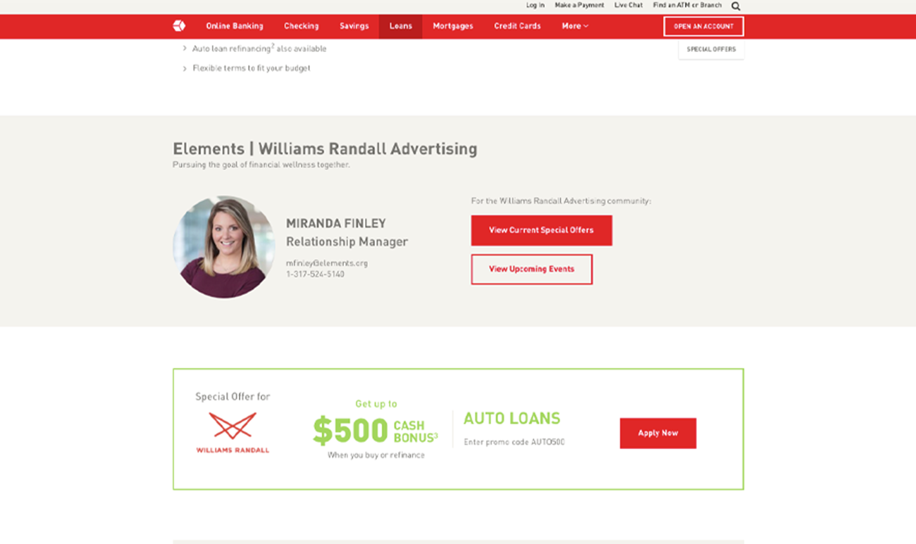 Another major component of optimizing the product pages was introducing personalized special offers (e.g., “Get a $500 cash bonus”), upcoming events, and contact information (e.g., the direct email for Miranda, the personal Elements Relationship Manager assigned to your company) based on their member profile and past site interactions. This personalized approach to the website experience matches the Elements experience that member companies already have through emails, in-person programs and more. So now, when an Elements customer visits the website, they will see the same special offer or upcoming webinar that they may have been told about in an email from their Relationship Manager, making the experience feel more connected and relevant.