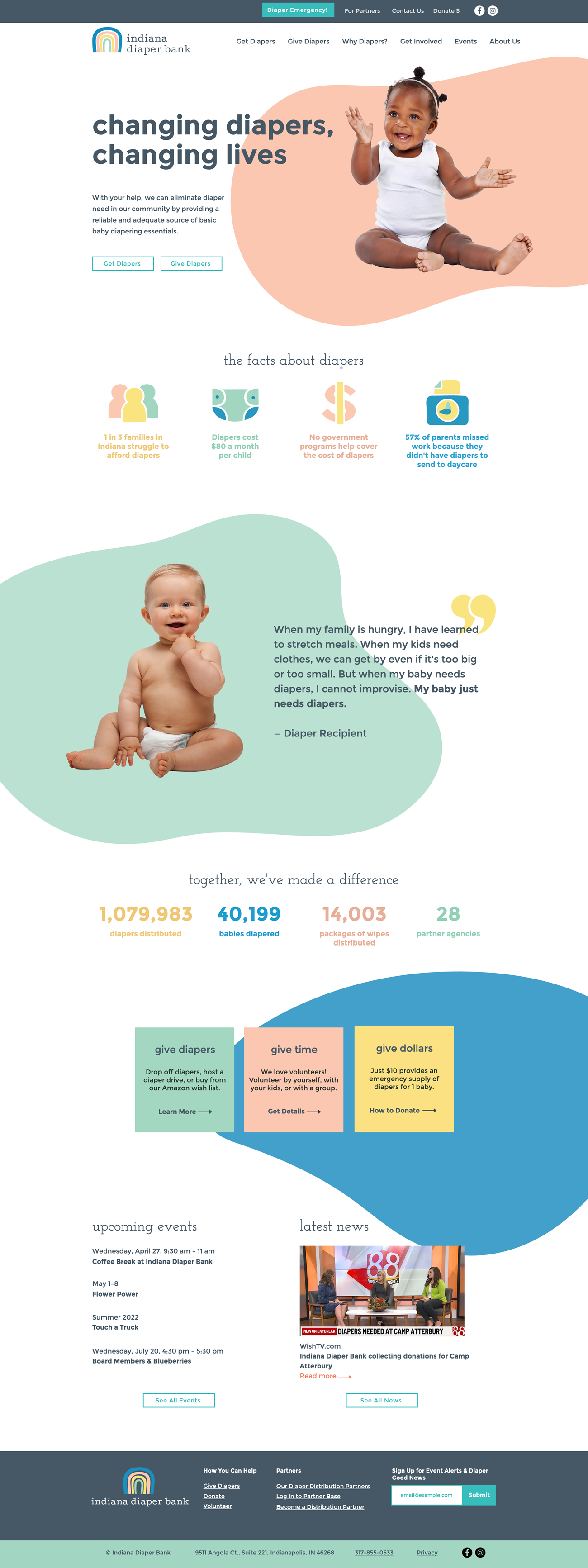 Other key components of the site redesign included an overhauled sitemap, a way to easily update content, and integrations with existing platforms. The new site architecture organizes content into high-level sections based on what a user hopes to accomplish—whether that be getting diapers, giving diapers, getting involved, or learning about Indiana Diaper Bank and why they do what they do. We also set up a content management process where news, events, and even those ever-growing stats can be updated all in one place. Events are connected to the Diaper Bank’s Eventbrite page and their donation and email management tool, Aplos, is integrated for continued use.