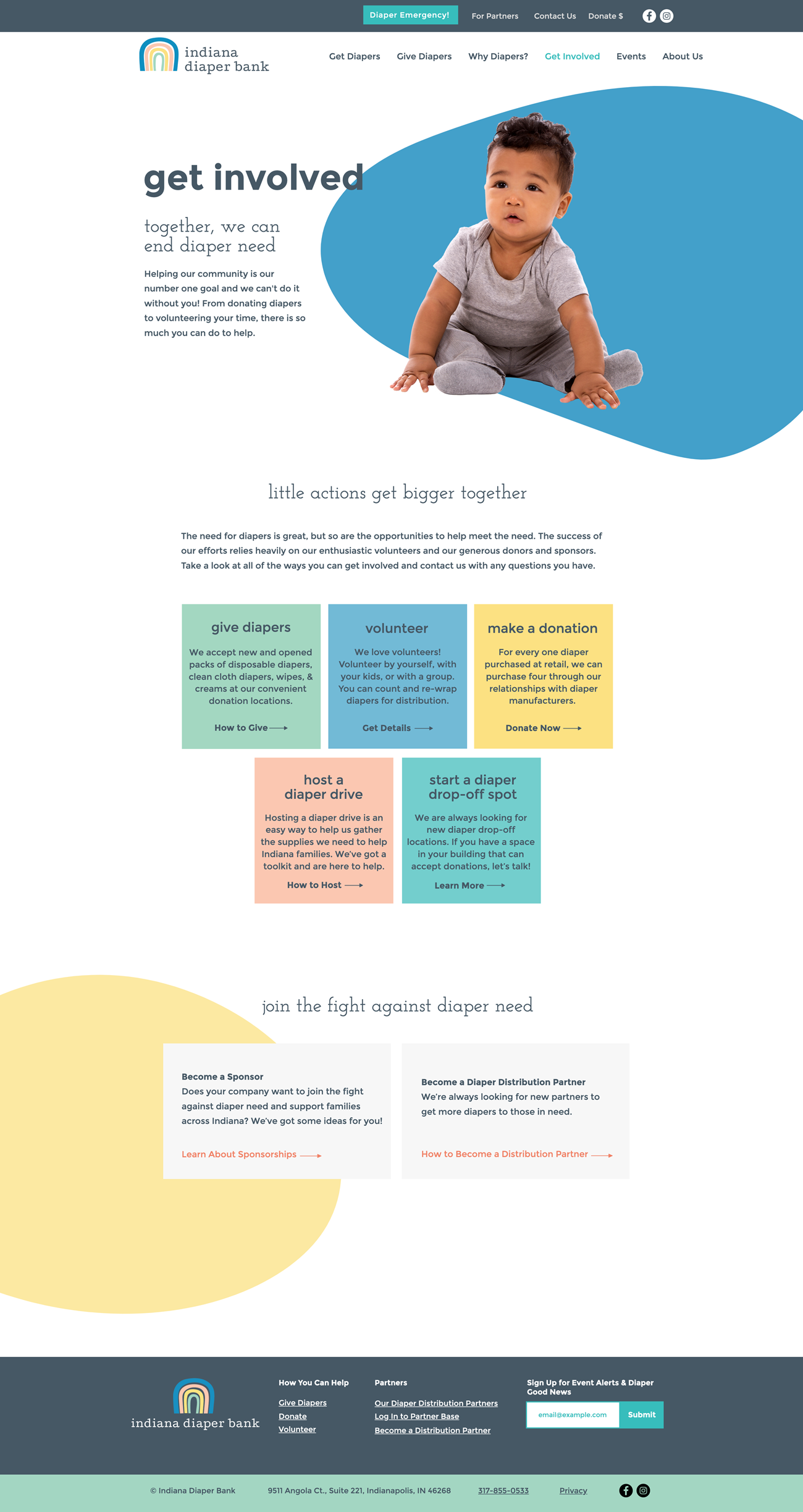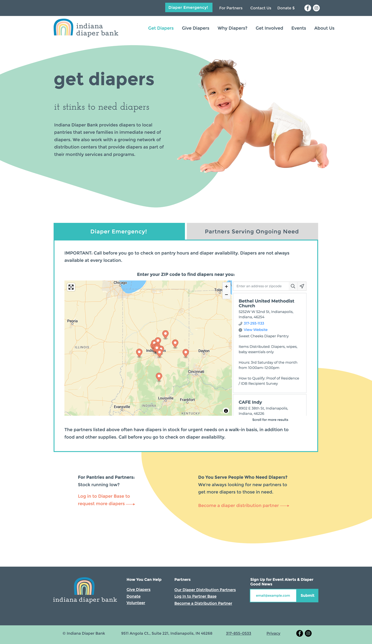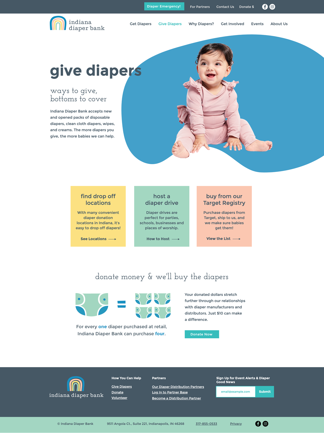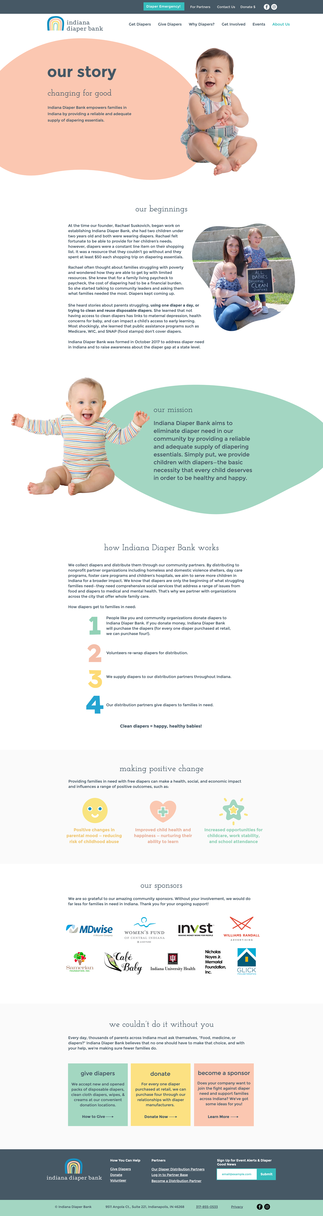 Once we had established the new brand look and feel, we began work on a new website that would be easy to navigate, have a clean design with plenty of white space, and share impactful storytelling. We focused the design of the new site on four key strategy points: communicate their mission, connect families with places to get diapers, encourage visitors to donate or get involved, and demonstrate Indiana Diaper Bank’s impact as an organization. The new homepage meets all of those key goals by using icons to educate the audience about diaper need, displaying prominent calls to action that allow users to self-select from multiple ways to get involved, and demonstrating the impact of the organization through quotes from diaper recipients and stats that call out everything from the number of diapers distributed (over one million!) to the number of babies helped.
