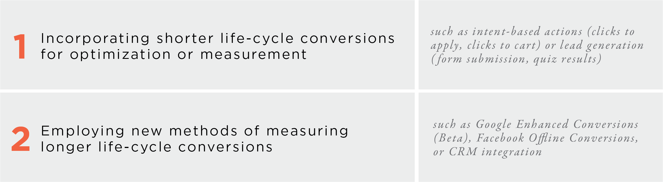 - We began tracking “Intent To” actions, which signified a click to purchase or apply and were more likely to happen in a shorter time period than actually completing the form involved.
