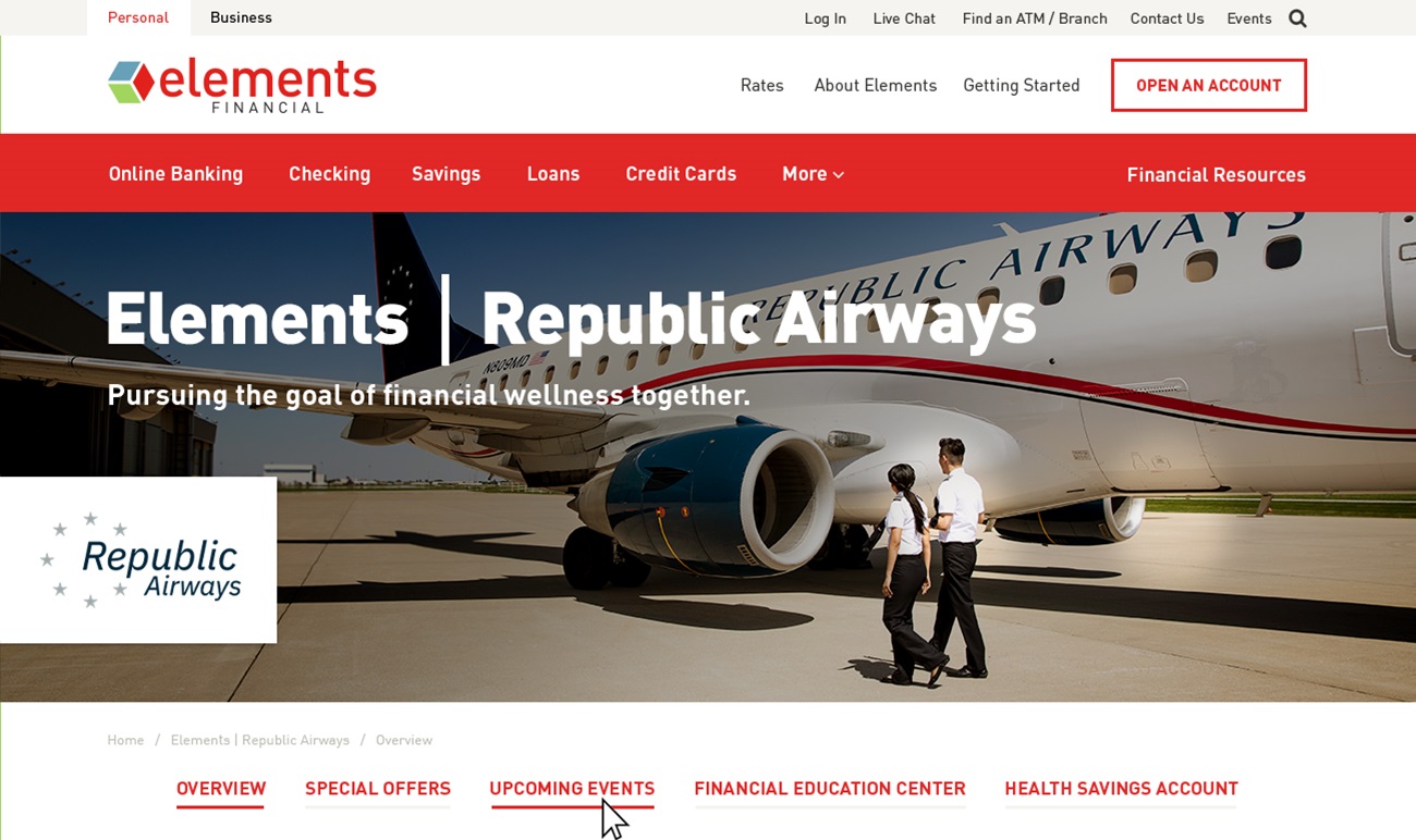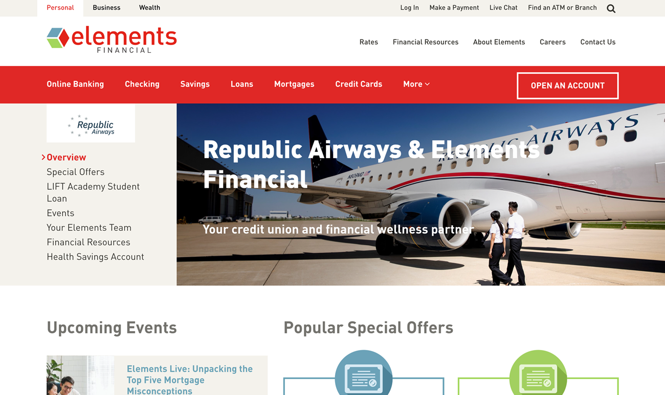 We set out to solve this problem by testing out a new variation of secondary navigation in one of the site’s sections. We selected Element's personalized partner pages to run a test. These personalized sections act like a site within a site, and if customers miss all the sub-pages in the section, their information needs are not met and potential revenue is lost. To tackle this issue, we explored different locations and styling for the secondary navigation and settled on a new placement to the left of the hero image—higher up on the page, more visually prominent, and separated from the page’s main content area. If this change helped increase engagement with the sub-navigation, our plan was to roll out this new strategy to other pages of the site.