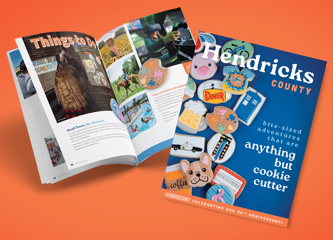For previous guides, we have leaned into original photography and custom illustrations. Both options provided interesting ways to highlight key attractions. For the 2024 guide, we decided to do something entirely different: we paired up with Mama Bird Bakery to design cookies that represent some of the county’s top attractions. We worked with the local baker to determine which attractions would showcase well on the cookies, then let Mama Bird work their baking magic. A few weeks later we met back at the bakery to select and photograph cookies for the cover and inside editorial pages. Throughout the guide, you’ll see cookies that highlight the Doctor Who Museum, Lucas Oil Indianapolis Raceway, Oasis Diner, coffee shops, trails, and more.