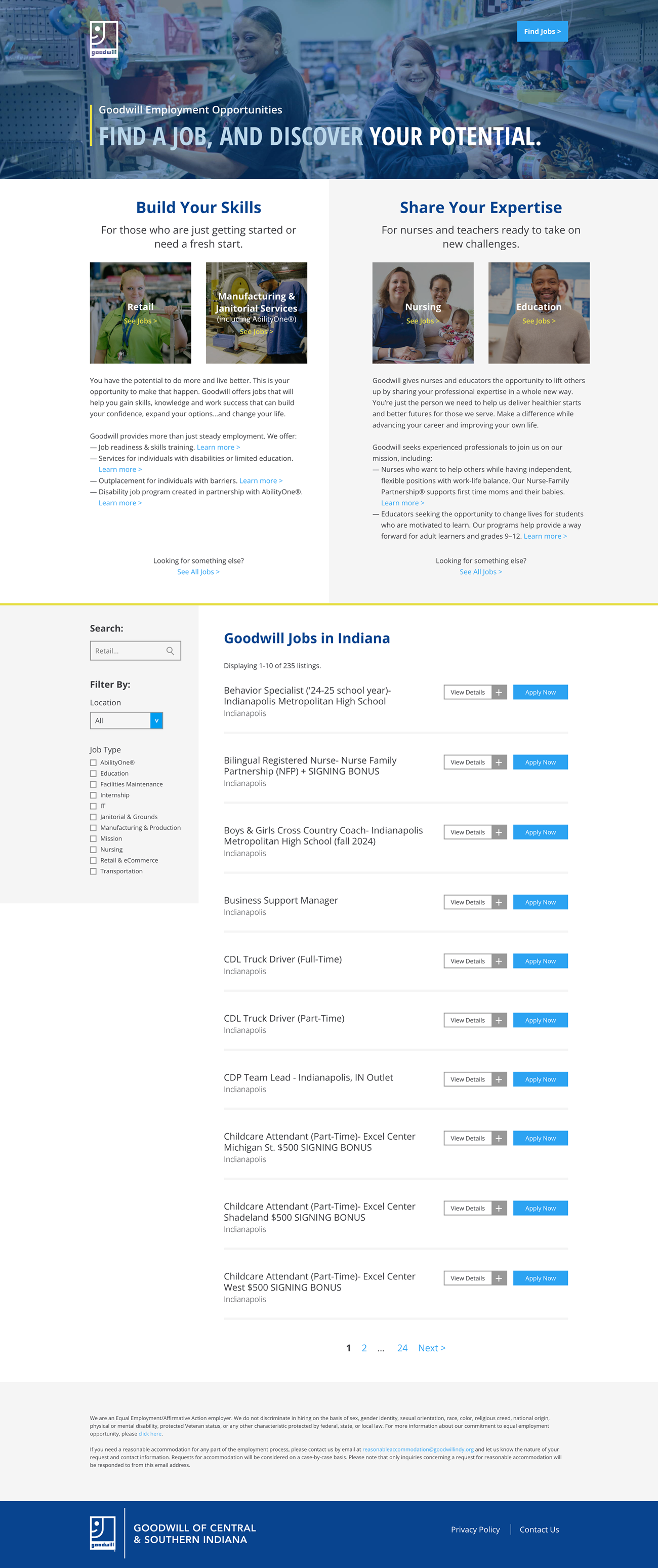 In early 2024, we created a new landing page for Goodwill’s AbillityOne roles, which are open to individuals and veterans with qualifying disabilities. This landing page will further recruiting efforts and help even more people find impactful work with Goodwill of Central & Southern Indiana.