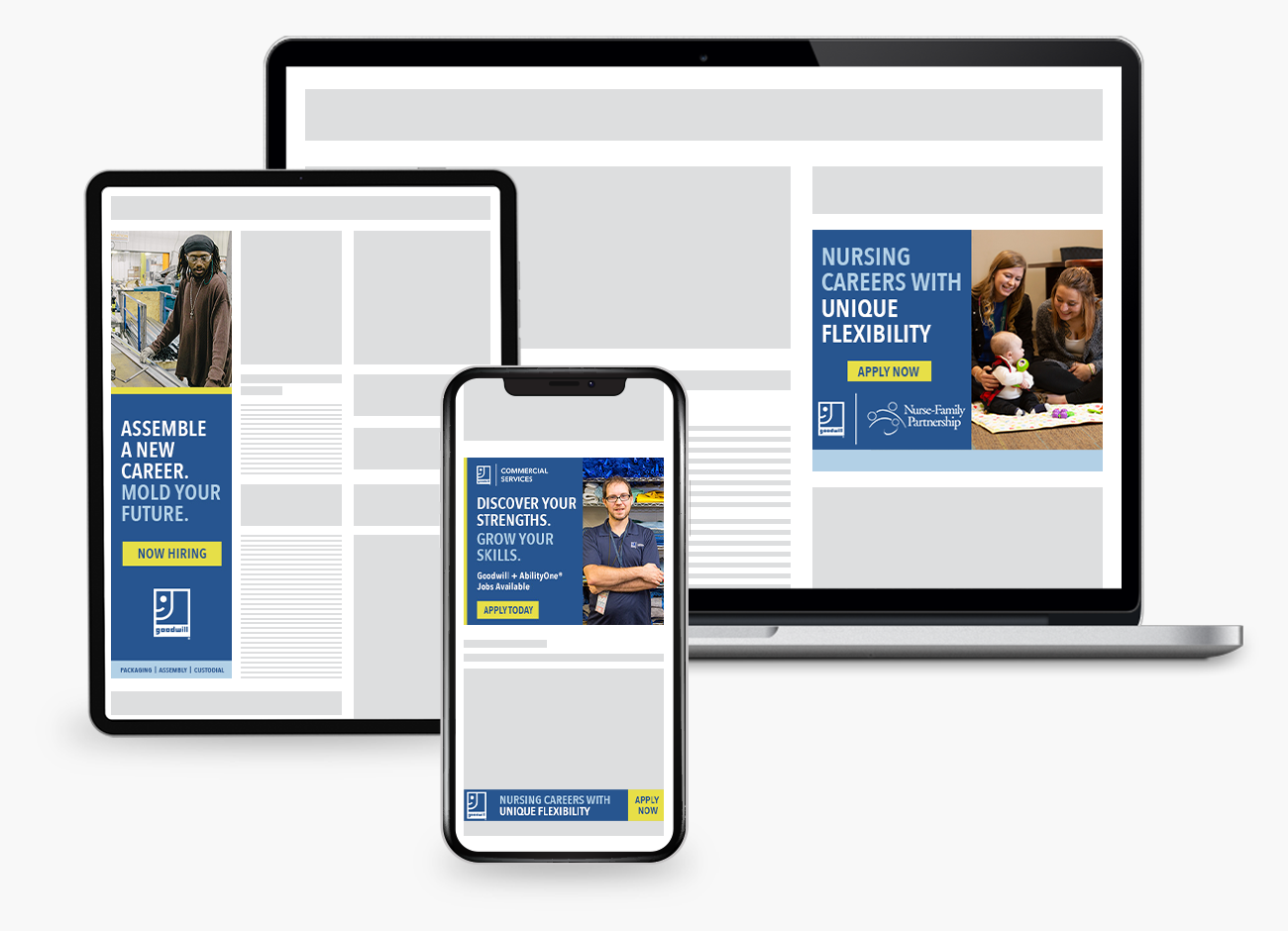 We set out to create a campaign that could reach multiple audiences. Our first audience included people interested in commercial services and retail roles, while our second audience included those interested in nursing and education positions. Our creative team crafted messaging for each audience. Meanwhile, our media team worked to figure out the most relevant geographies for the campaign. They also narrowed down our audience segments by education level and career interests.